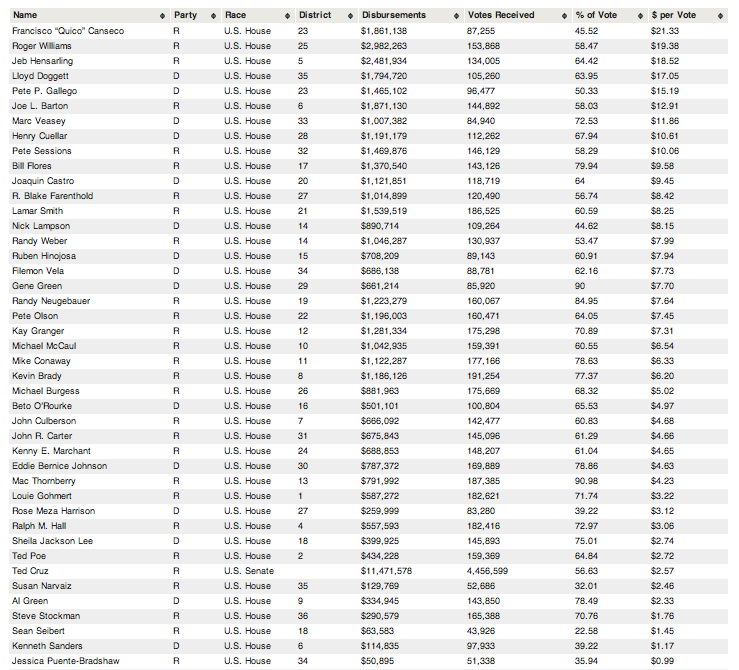 “One caveat about the spending data – the expenditure totals used here represent all spending since the beginning of the 2012 election up to Oct. 17, 2012, as reported on the pre-general election reports due on Oct. 25, 2012. Candidates are likely to have spent additional money in the days leading up to election day that is not represented here. These numbers will be made available in the post-general report due in the beginning of December. Two of the highest dollar-per-vote spenders come from Congressional District 23. Topping the list is Republican U.S. Rep. Francisco “Quico” Canseco, who spent $21.33 per vote and lost his seat to Democratic challenger state Rep. Pete Gallego. (Canseco has yet to concede.) Gallego also ranked high on the list in 5th place, spending $15.19 per vote.”